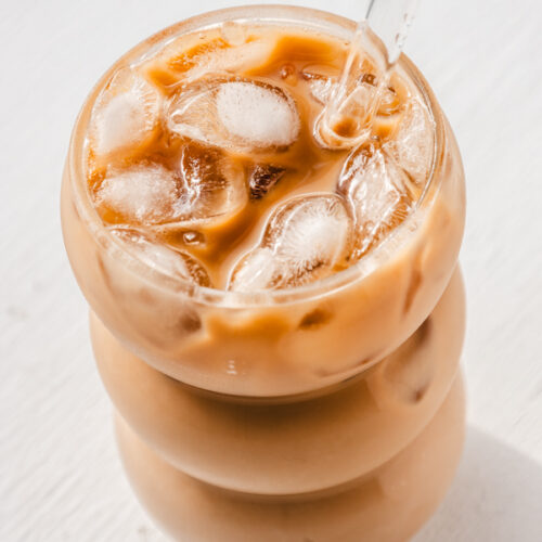 - Pour coffee mix over ice cubes and top with ½ c. milk.